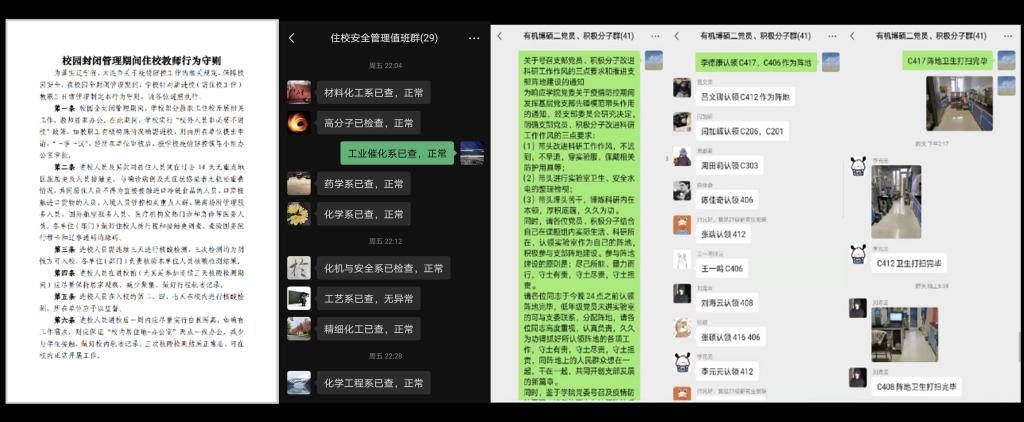 在封校之时,公司多名教师挺身而出,火速投入到忙碌的驻校工作中。身边的同学说:“看到老师辛勤的身影,有他们在,就感到安心。”为了保障公司各项工作有序展开,他们克服了种种困难:化学工艺系教师班延鹏的孩子仅有三岁,家中需要帮手,尽管十分牵挂爱人和孩子,却毅然坚持住校开展科研工作;材料化工系教师王立达决定驻校开展工作时,孩子还在病中,而他自己也才刚刚痊愈不久,身体十分虚弱。他们当中的很多人已经不是第一次驻守校园了,精细化工系教师姚起超等很多老师在去年封校期间就曾全程驻守在校园。他们再次以高度的责任感和使命感冲锋在前,舍“小家”,顾“大家”,齐心奏响铿锵战疫旋律。