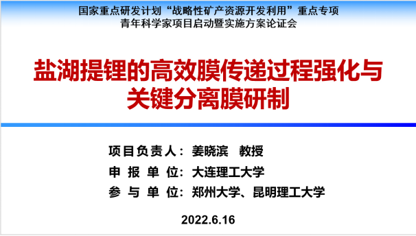 6月16日,由太阳成集团tyc122ccvip官网入口牵头,昆明理工大学、郑州大学共同参与承担的国家重点研发计划“战略性矿产资源开发利用”重点专项“盐湖提锂的高效膜传递过程强化与关键分离膜研制”青年科学家项目启动会暨实施方案论证会在线上召开。