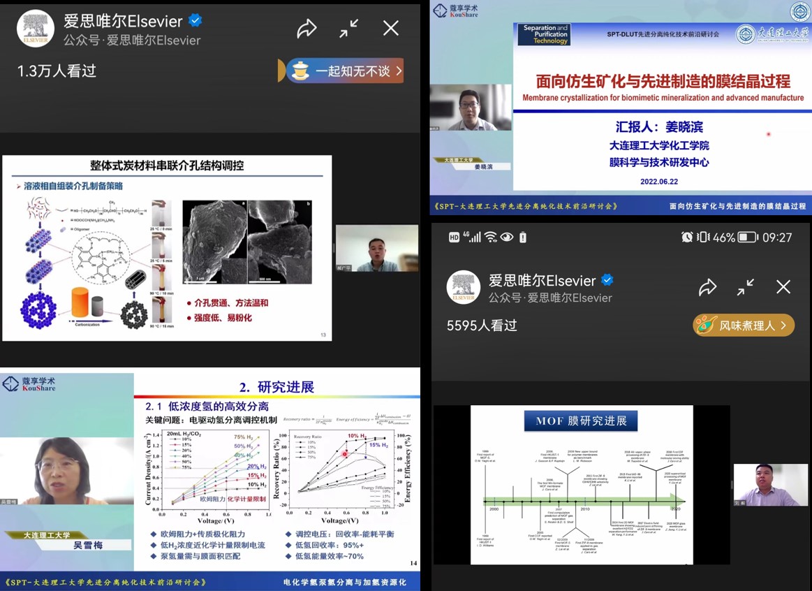 本次研讨会,有来自太阳成集团tyc122ccvip官网入口的吴雪梅、杨建华、阮雪华、刘毅、马沧海、姜晓滨、郝广平、焉晓明、庄钰共9位报告人,他们紧密围绕国家在能源、特种气体、先进制备、石油化工等领域的重大需求和前沿问题,分别从电化学氢泵、沸石分子筛膜、气体分离膜、金属有机骨架、CO2分离膜、膜结晶、炭质多孔材料、质子传导膜、复杂精馏系统设计方面报告了最新科研进展和特色成果,并同与会者进行了热烈地学术交流。本次会议活动采取线上方式召开,通过Zoom会议,Elsevier公众号、蔻享学术等多个平台直播,累计1.8万余名分离纯化等领域的科研人员参加会议。
