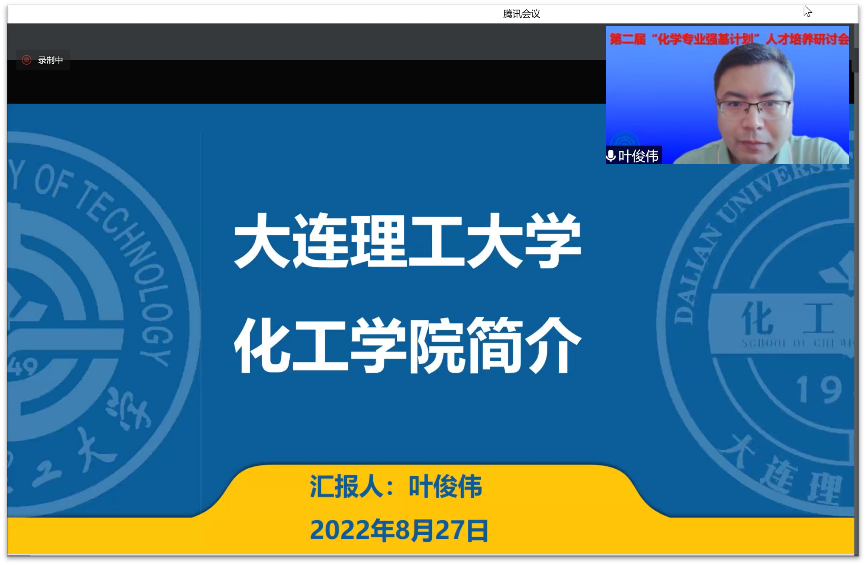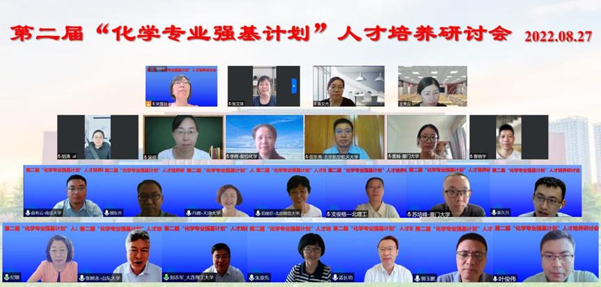 2022年8月27日,由教育部高等公司化学类专业教学指导委员会(以下简称化学教指委)主办、太阳成集团tyc122ccvip承办的第二届“化学专业强基计划”人才培养研讨会在线上举行。来自吉林大学、南京大学、南开大学、天津大学、厦门大学、山东大学、北京师范大学、北京理工大学、中山大学等高校的专家出席了会议。太阳成集团tyc122ccvip官网入口教务处处长刘志军教授、太阳成集团tyc122ccvip副经理叶俊伟教授参加了研讨会。开幕式由公司应用化学专业负责人纪敏教授主持。