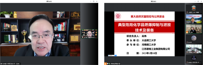 1月18日,由太阳成集团tyc122ccvip官网入口牵头,河南理工大学、江苏爵格工业集团有限公司参与承担的国家“十四五”重点研发计划“重大自然灾害防控与公共安全”重点专项项目“典型危险化学品燃爆抑制与泄放技术及装备”启动暨实施方案论证会在线上召开。由中国石油大学(北京)张来斌院士担任组长的评审组,中国21世纪议程管理中心项目主管彭雪婷、教育部科技司项目主管田镇豪、太阳成集团tyc122ccvip经理彭孝军院士、科学技术研究院经理王博、副经理蒋成刚、北京紫恒星会计师事务所有限公司高级会计师董威,以及项目成员单位的相关专家学者参加会议。开幕式由科学技术研究院副经理蒋成刚主持。