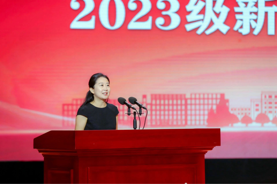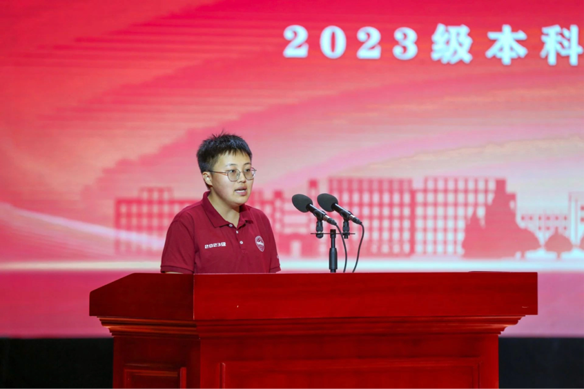 典礼上,过程装备与控制工程专业2023级本科生潘文惠同学作为代表新生发言。讲述了她从雪域高原西藏来连求学,一步一步迈入梦想殿堂的故事。她号召全体新生“将个人的小我与国家的大我紧密相连”,选化工、学化工、爱化工。