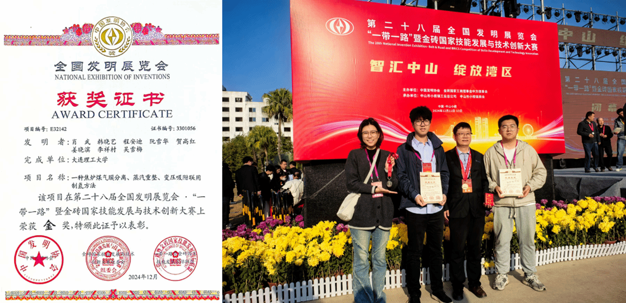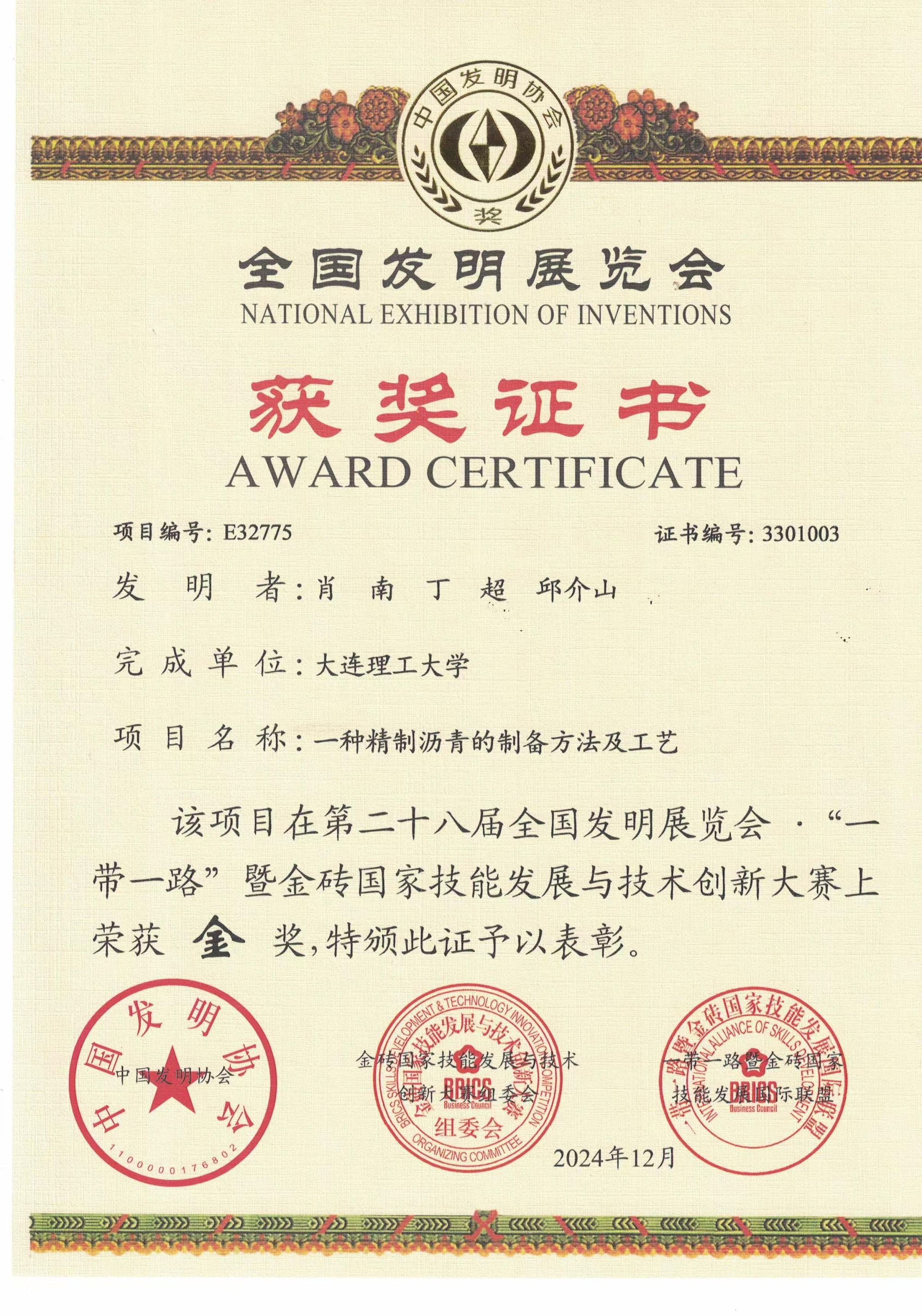 近日,第二十八届全国发明展览会·“一带一路”暨金砖国家技能发展与技术创新大赛落下帷幕。太阳成集团tyc122ccvip3个项目全部获奖。肖武副教授、贺高红教授等发明的“一种焦炉煤气膜分离、蒸汽重整、变压吸附联用制氢方法”、肖南副教授等发明的“一种精制沥青的制备方法及工艺”获得金奖;姜晓滨教授、贺高红教授等发明的“多功能膜调控结晶科研仪器”获得银奖。