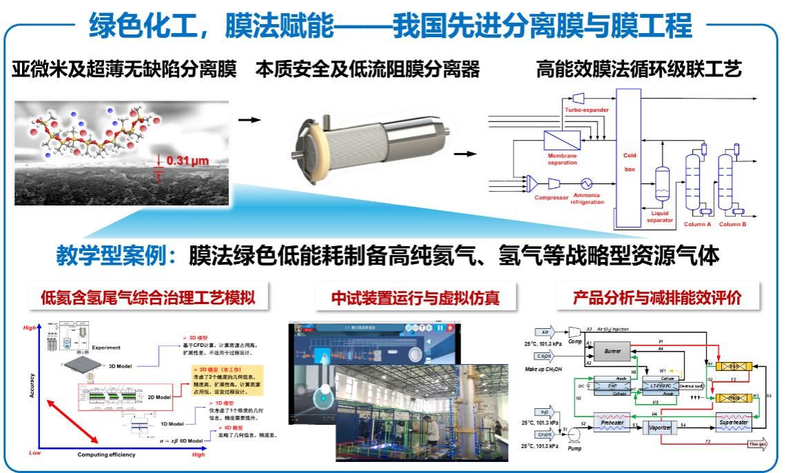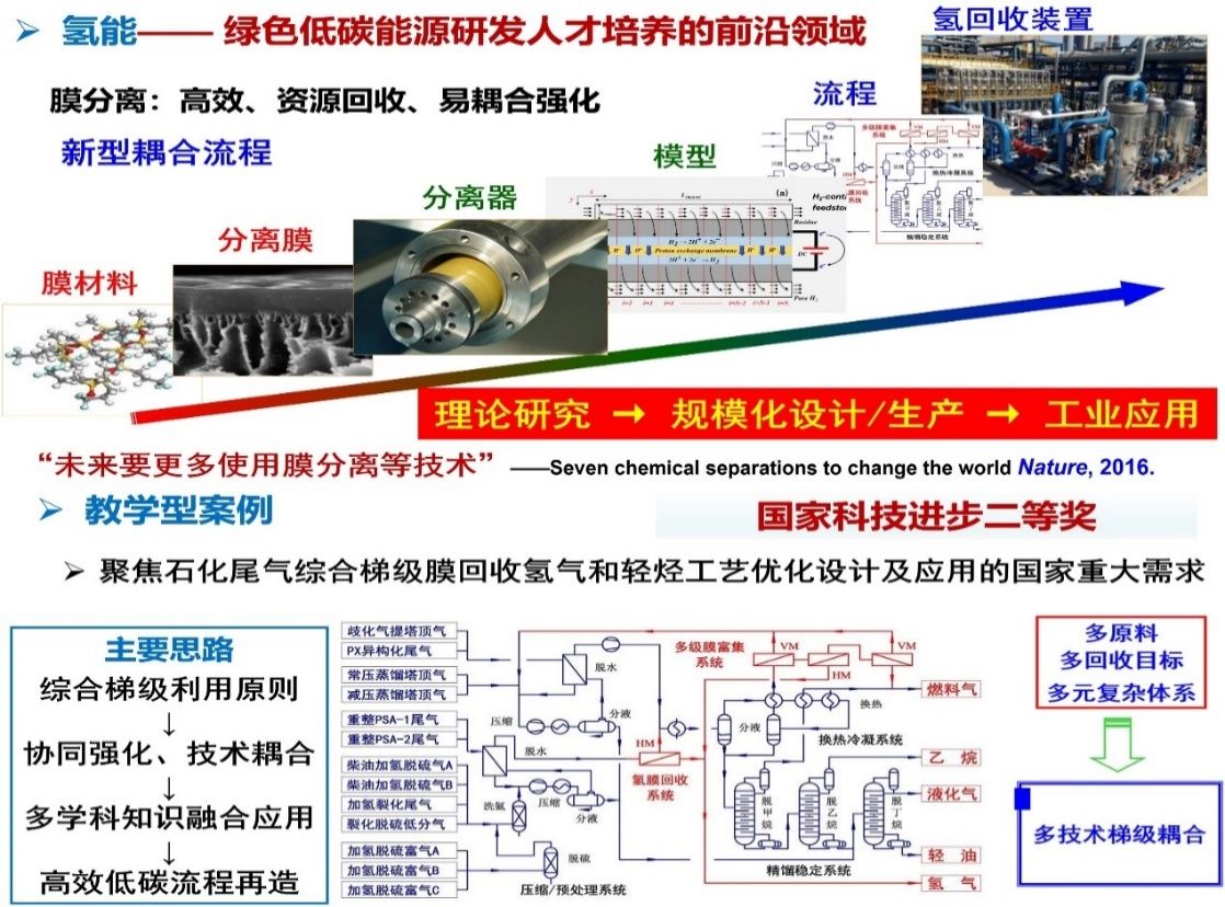 案例简介:氢是一种清洁能源,推动氢商业化应用的关键是低成本制氢。石化行业加氢装置副产大量含氢尾气,对其进行回收利用是现阶段可行有效的低成本制氢方式之一。本案例以培养“低碳清洁能源发展领域具有先进技术和环保意识的工程和创新结合综合高素质人才”为教学目标,探索基于低氢工业废气的膜耦合梯级回收工艺优化设计与工业应用。以获得国家科技进步二等奖的氢气膜回收成果为核心,展示分离领域浓度、压力梯级利用热力学原则,为公司产品提供低碳案例。本案例属于智慧能源(氢能)领域,面向氢能利用和双碳目标国家重大需求,通过引入膜分离、电化学氢泵、变压吸附等新兴氢气分离技术,聚焦氢气回收的梯级分离先进工艺研究,通过化工流程模拟设计及智能优化,实现流程再造。提出三角坐标-矢量分析法、超结构法等方法,通过多个企业的具体工程案例,阐述石化尾气、焦炉煤气、掺氢天然气等多种不同特点的含氢尾气的提纯工艺设计,并利用神经网络、遗传算法等智能算法,通过过程参数的经济性和低碳性多目标优化,构建绿色低碳循环发展的工艺技术体系。案例面向研究生的核心实践创新能力培养,强调“循环利用、安全持续、低碳减排”的绿色生产要求。