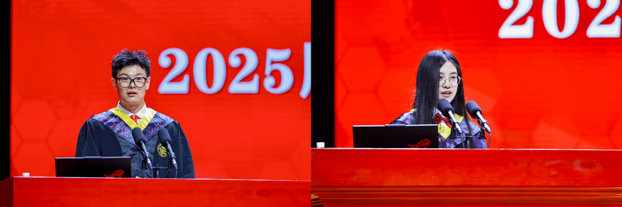 2025届本科生毕业生代表王新奥和研究生毕业生代表金桐分别发言,二人共同抒发了对母校的感恩之情,分享了拼搏经历,表达了不负期望、砥砺前行的决心。