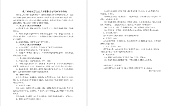 对于积极分子发展本支部制定了详细的考核措施,使得下阶段发展对象的选拔有了依据,也使得支部选拔更加公开透明,特别是在化工原理硕第一员工党支部和化工原理硕第二员工党支部合并后,对积极分子的审查有了统一的标准。