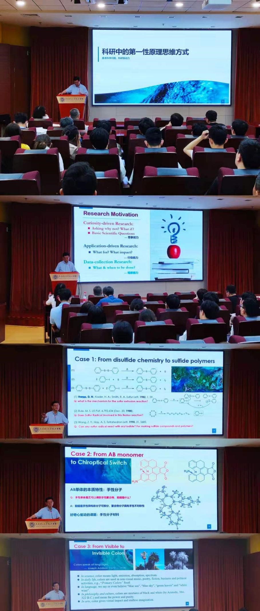 王植源教授通过三个具体的案例为大家介绍了他在科研工作中的切身体会,讲述了好奇心是如何驱动科研工作的开展,并取得重大突破。王植源教授首先通过埃隆-马斯克成功的秘密:“第一性原理思维模型”的成功运用,指出:“在工作中不要倾向于跟风,这样的结果只能产生细小的迭代发展。要借助第一性原理模型,立足于基础原理,层层剥开事物的表象,回到初始位置挖掘原始创新工作。”。随后,王植源教授通过亲身的例子,从二硫化学到聚苯硫醚、二酐单体到AB单体与手性光开关分子,从近红外隐身材料的有色到无色的革新发展,总结了分子水平修饰与演绎推理设计的思维方式,进一步为大家阐释了做科学研究要大胆地尝试、多方位的思考,用基本原理解释发现的实验现象,近而进行创造性思考(好奇心驱动),提出革新想法,最终通过实验验证并不断改良。这样才能源源不断地产生原始创新想法,持续推动我国科技事业的发展与创新。
