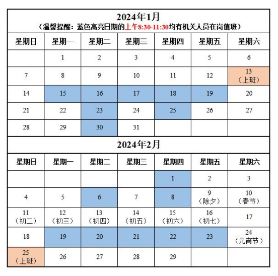 一、放假后第一周(1月15日-19日)、开学前一周(2月19日-23日)及其他周的每周二、周四,即表格中蓝色高亮部分(上午8:30-11:30),公司机关均安排人员在岗值班,确保各项业务顺利开展。