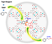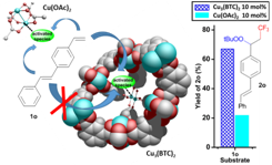 含有过氧化基团的二氢青蒿素分子中引入三氟甲基可实现抗疟疾功能强化,烯烃的三氟甲基化—过氧化双官能化反应为结合两者的优势提供了更多的可能性;然而,被过渡金属活化的三氟甲基中间体与过氧化中间体在均相条件下难以兼容。利用铜基MOFs中处于单分散态铜节点的轴向空配位,对三氟甲基化试剂和过氧化试剂实行“空间隔离”、分别活化,使得两种高活性中间体得以在MOFs非均相体系中得到兼容,从而在烯烃中同时引入具有重要药用价值的三氟甲基和潜在抗疟疾活性的过氧化基团。有趣的是,反应原位生成高度活泼的含三氟甲基中间体物种被禁锢在铜节点周围“碗底”状的限域环境中,这种“锚定”式的中间体对于烯烃附近基团的位阻效应非常敏感,使得反应体现出高度的“择形性”,首次实现多烯烃位点位阻效应的精准识别,转化多烯烃底物中的端位烯烃、保留非端位的烯烃,迥异于均相对照体系;规避了繁复的保护与去保护过程,对含复杂结构药物分子的转化具有重要启发。该工作由本团队员工祁波、李莫尘完成,发表于催化领域国际期刊Catalysis Science & Technology (JCR一区),并被评选为第7卷,第4期杂志封底文章。共同通讯作者是张铁欣博士与段春迎教授。
