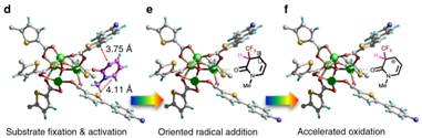甄选具有光还原能力的有机染料分子三苯胺作为配体母核,通过配体工程在光敏型羧酸配体骨架中插入噻吩基团,显著增强所构筑的金属有机框架MOFs材料在可见光区的吸收;弱化激发态光还原电位,增强基态氧化电位;有机配体π体系增大导致配体间芳香堆积,造成金属节点配位扭曲,引入配位不饱和位点,“锚定”底物分子、拉近芳香底物代谢活性位点与光催化中心距离,进而在金属有机框架MOFs孔道微环境中改变反应动力学决速步骤,实现了远优于现有均相体系的区位和非对映立体选择性,并成功应用于具有生物活性的精细化工中间体和药物分子代谢活性位点的高选择性保护。金属有机框架MOFs作为晶态材料,其空间结构长程有序性和孔道内部丰富的弱作用位点能够“约束”底物和中间体,易得到均相溶液条件下难以形成的特定构型和构象,不仅可用于调控反应区位和立体选择性,也可通过X射线单晶衍射直接观测,有助于深入理解金属有机框架限域光催化的构效关系,揭示其独特魅力与优势。相关工作由张铁欣博士与本团队员工郭向阳、史雨生完成,近期发表在Nature Communications, 2018, 9, 4024. (IF: 13.691, JCR一区) 通讯作者为段春迎教授。