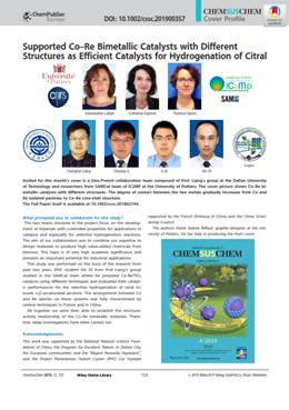 近日,梁长海教授与法国普瓦捷大学Gwendoline Lafaye教授等合作,首次研究了由催化剂结构引起的Co-Re相互作用在不饱和醛加氢反应中的催化机理。团队成员采用不同的制备方法得到了一系列具有不同接触界面结构的Co-Re双金属催化剂(Isolated结构、Janus-Type结构以及Core(Co)-Shell(Re)结构)。研究表明,随着活性金属接触度的增加,催化剂相互作用增强,有效促进Re前体的还原。DOS计算结果证实低价态的Re组分更有利于加氢中间物的吸附。此外,低价态活性金属相也会增强活性位的氢活化能力,进一步提高催化剂的柠檬醛加氢反应性能。同时,金属间相互作用可以促进电子由Re向Co偏移,有利于柠檬醛中富电子醛基官能团在Re组分表面的吸附。基于以上不同作用机理,具有Janus-Type结构以及Core-Shell结构催化剂的反应活性显著高于单金属和具有Isolated结构的双金属催化剂;然而Co-Re相互作用的形成造成金属间过度接触,会在一定程度上抑制柠檬醛加氢反应,动力学分析拟合结果进一步证明了该观点。相关结果发表在ChemSusChem(2019, 12, 807-823)上,并被选为封面论文介绍。ChemSusChem是国际化学领域最具权威和最有影响力的学术期刊之一,2018年影响因子高达7.411.
