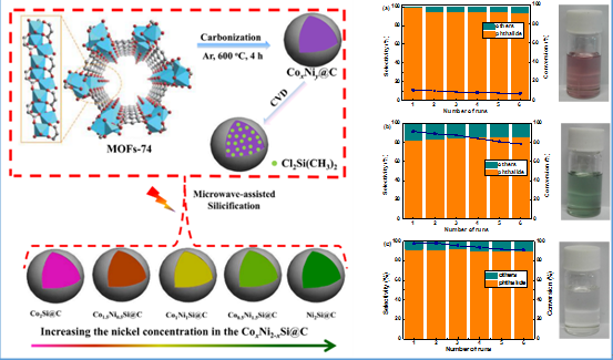 过渡金属硅化物是非金属硅原子进入过渡金属的晶格所形成的一类金属间化合物。硅原子与金属间的相互作用导致金属晶格的扩展以及金属键长的增加,使得金属d能带收缩和费米能级附近的态密度增大,从而赋予了过渡金属硅化物特殊的物理化学性能,是一类有潜力的优良催化材料。此外,大部分金属硅化物具有良好的抗氧化和抗腐蚀性及较好的化学稳定性,在碱和酸(除HF)性溶液中一般不溶解,有利于维持其在苛刻条件下的结构稳定性,从而延长其作为催化新材料的寿命。基于金属硅化物固有耐腐蚀性和双金属硅化物间的协同效应,课题组张亮亮博士和陈霄副教授采用微波辅助化学气相沉积法,以MOF-74为前驱体,二氯二甲基硅烷为硅源,成功制备了不同化学计量比的钴镍双金属硅化物催化剂。研究发现少量Ni取代的Co2Si催化剂(Co1.5Ni0.5Si@C)在邻苯二甲酸酐加氢反应中具有与贵金属催化剂(Au、Pd和Pt)相媲美的催化活性和对目标产物邻羟甲基苯甲酸内酯的高选择性(转化率>97.7%,选择性>91.8%),测试结果明显高于过渡金属催化剂。此外,双金属硅化物催化剂较传统金属Ni和Co催化剂具有更强的耐酸腐蚀性能。上述工作为在苛刻反应环境下的高效、高选择性和持久稳定的催化剂设计提供一种思路。