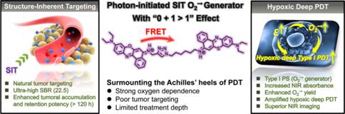 光动力治疗(Photodynamic Therapy, PDT)作为一种有别于传统癌症治疗手段(手术、放疗、化疗等)的新型光介导治疗方式,凭借其优异的物理靶向性,良好的可重复应用无耐药性、以及创伤小等优点,日渐成为一种颇具前景的肿瘤治疗手段。光动力治疗过程中,光敏剂可在特定波长激发光的作用下产生活性氧类物质(reactive oxygenspecies, ROS),导致肿瘤细胞坏死和凋亡,或通过破坏肿瘤组织中的微血管造成局部缺血缺氧导致癌细胞死亡。然而,传统光敏剂普遍具有高氧依赖性、肿瘤靶向性差、治疗深度有限等缺点,这严重限制了PDT在临床中的广泛应用。针对肿瘤乏氧问题,团队成员之前开发了首例近红外光控小分子超氧阴离子自由基产生体(O2−•,),成功应用于荷瘤小鼠厌氧实体瘤模型光动力治疗,并揭示了O2−•在严重低氧环境下(2% O2)仍具有抗癌活性的潜在机制(J. Am. Chem. Soc.2018, 140, 14851−14859)。另一方面,团队提出了利用福斯特共振能量转移机制引入罗丹明阳离子的方式,构建光敏剂自发靶向肿瘤部位,并提出了“结构固有靶向诊疗敏化剂”的概念(J. Am. Chem. Soc., 2018, 140, 15820-15826),为肿瘤的靶向治疗提供了新思路。然而,这些方法对于实体瘤内部治疗效果依然有限。