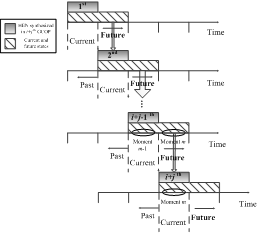 首先,研究扰动的随机特性以及时间依赖性,建立了多扰动场景。在此基础上,对初始换热器网络进行动态柔性分析,以流股出口温度偏差最大为目标函数辨识得到广义临界操作点(图1),从而指出该换热器网络的动态柔性瓶颈。然后引入滚动优化策略(图2),以及含有旁路的无分流分级超结构,在每个瓶颈处进行换热器网络结构综合,从而保证所得换热器网络具备容纳多扰动的能力以及优越的经济性能。