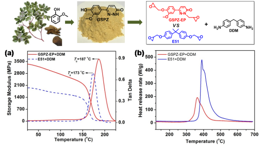 太阳成集团tyc122ccvip高分子材料系蹇锡高院士团队的翁志焕副教授等人基于课题组此前在高性能高分子材料的工作,通过简单易行的合成步骤以生物质来源的愈创木酚和丁二酸酐为原料得到类双酚的含氮芳杂环的生物基单体。进一步的工作显示,以此单体制备的生物基环氧树脂,在固化剂DDM的作用下,表现出的综合性能较目前应用最为广泛的石油基双酚A型环氧树脂更为优异:玻璃化转变温度提高了14oC,700oC下残炭率(N2氛围)、30oC下储能模量和室温下杨氏模量分别提高了140%、70%和93%。值得注意的是,含氮芳杂环的引入,不仅提高了生物基环氧树脂的固化速率,同时赋予了其优异的本征阻燃性能,克服了石油基双酚A型环氧树脂阻燃性能差的缺点。本工作为制备生物基芳杂环化合物和构筑高性能生物基高分子材料开辟了新方法。