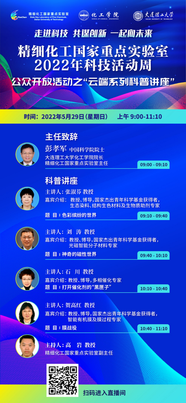 为响应国科基函〔2022〕29号《科技部基础研究司关于国家重点实验室在2022年全国科技活动周期间开展公众开放活动的通知》文件号召,宣传科技创新成果、开展科技为民服务活动,精细化工国家重点实验室将于5月29日举行2022年实验室科技活动周公众开放活动,主题是“走进科技,共谋创新,一起向未来”。