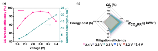 图3. 模拟海水中CO2RR全裂解以及耦合反应体系的经济性和二氧化碳净消耗分析。(a) CO FEs和电流密度。(b) 反应体系的经济性和二氧化碳净消耗分析。