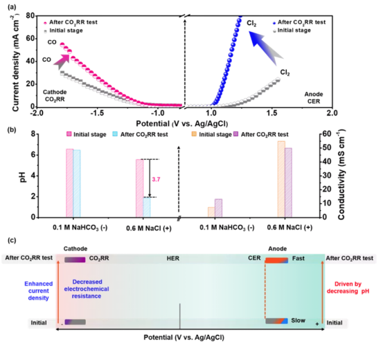 图2. 阳极CER 对CO2RR的促进机制。(a) 反应前后的LSV曲线(CO2RR在0.1 M NaHCO3溶液和CER在模拟海水中)。(b) 反应前后阴阳极电解液pH和电导率的变化。(c) CO2RR与CER耦合反应过程示意图。