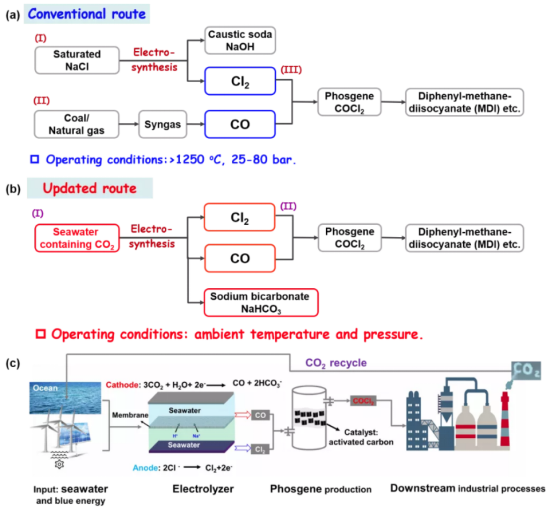 图1. 光气法生产MDI(二苯甲烷二异氰酸酯)的工艺流程图:(a)传统路线,(b)新路线,(c)海水中CO和Cl2直接共生产的工业蓝图。