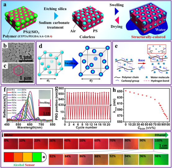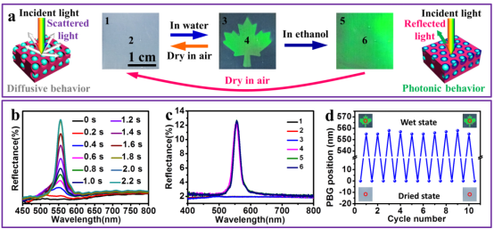 它的原理是,受莲蓬启发,将聚苯乙烯(PS)微球引入到反蛋白骨架中,制备了粒子嵌套的双反蛋白结构。水响应过程是通过诱导反蛋白骨架孔内的PS球在水环境中从随机分布到受液体浮力作用而均匀分布,从而消除了散射干扰,产生了亮丽的结构色。