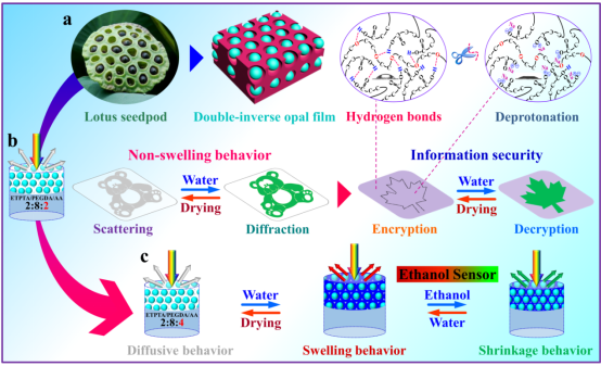 图 1. 氢键诱导润湿性改变的双反蛋白光子晶体膜的原理和功能示意图