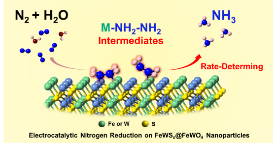 在该工作中,作者将催化剂涂覆在气体扩散电极表面,并在流动池中进行氮气还原反应的测试。实验中,测试气体通过气体预处理装置进行严格的氮氧化合物等杂质的祛除;同时,实验采用15N2为原料,通过1H-NMR对15NH4+的产量进行了标定,确保了实验结果的可靠性。FeWSx@FeWO4催化剂展现出了优异的氮气还原性能,在−0.45 V (vs. RHE)下,氨气产率达到了30.2 ug h-1 mg-1,同时获得了16.4%的法拉第效率。氮气程序升温脱附实验揭示了FeWSx@FeWO4催化剂可以更有效地吸附和活化氮气,使得催化剂在氮气还原反应中具有更大的优势。原位电化学Raman技术检测到了催化剂表面在反应过程中没有来得及的消耗的金属-联氨反应中间体,并且,该Raman信号与催化剂表面吸附肼的信号相同。之后,使用肼(N2H4)以及15N同位素取代的肼代替N2作为反应底物,实验证明了该催化剂具有将一分子肼加氢均裂生成两个氨分子的能力。进一步,在催化剂表面吸附相近浓度的肼,肼还原生成氨的速率与氮气还原生成氨的速率相近。因此,证实了氮气还原反应的速率控制步骤是在催化剂表面形成金属-联氨作为关键的中间体后,进一步加氢并使N-N键断裂。