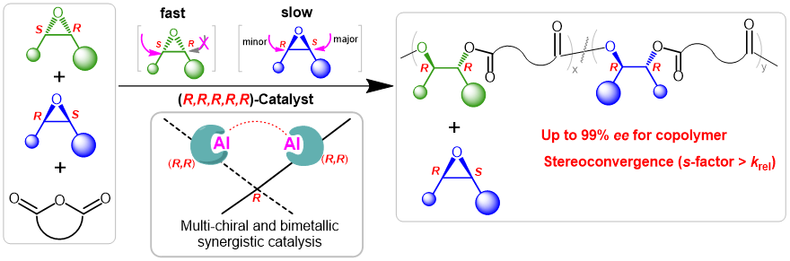 近日,精细化工国家重点实验室吕小兵教授首次报道了双金属催化剂催化的顺式内环氧烷烃和环状酸酐的对映选择性拆分共聚,能够一锅制备出光学活性的聚酯和对映纯的内环氧烷烃。此外,该研究中还发现了意料之外的立体汇聚现象,即反应所得的选择性因子数值远远大于动力学拆分系数值(s-factor>krel)。通过催化剂的筛选,发现催化剂配体上的取代基位阻、桥联基团的结构和手性构型都深刻影响反应的活性和对映选择性。而当使用配体上苯酚邻位没有取代基的双金属催化剂时,这种对映汇聚式拆分聚合不仅得到了立体选择性达到99% ee值的聚酯 (s-factor=437)材料, 还同时实现了内环氧烷烃的高效拆分过程(krel = 118). 通过DFT理论模拟并结合实验证据,表明在该聚合反应过程中,对映位点控制机理和链末端机理同时存在,共同促成了此立体汇聚式共聚过程,这也是首次在聚合过程中发现立体汇聚现象。