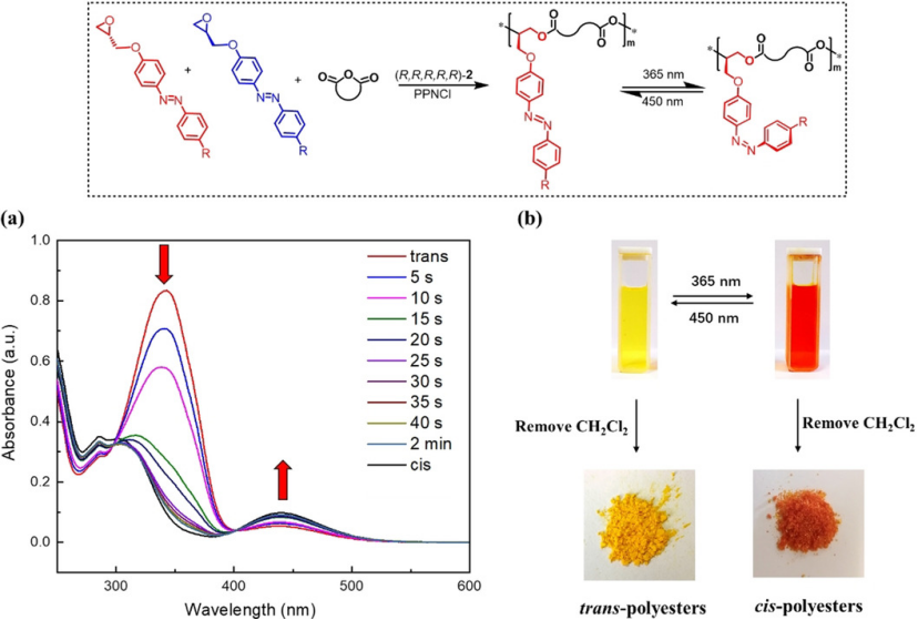 近日,精细化工国家重点实验室吕小兵教授通过含有偶氮苯基团的环氧烷烃单体与环状酸酐的对映选择性聚合,制备出了主链全同结构的偶氮基聚酯材料。其中,所有带有反式偶氮苯官能团的聚酯均为典型的半结晶性材料,拥有153到231oC的熔点,而相应的顺式偶氮苯聚酯材料均表现为无定形态。通过光照辐射,他们成功的诱导偶氮苯官能团实现顺式-反式的可逆转变,即可光控实现聚合物由结晶态到无定形态的可逆转变。此外,通过1:1混合相反构型的反式偶氮苯聚酯则能够制备出相应的立体复合材料,并表现出与单一构型聚酯材料完全不同的结晶性。有趣的是,该偶氮基聚酯的立体复合物也能够通过光控过程实现结晶态到无定形态的可逆转变。