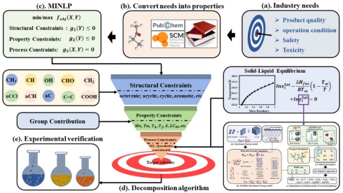 除了结晶溶剂与反应溶剂,化工产品的设计问题也是目前的研究热点之一,针对该问题,团队取得了系列突破性成果。首先建立了一个集成10个子模型(分子结构、性质、过程、成本、定价、经济、质量、可持续性、环境和性能)的通用框架,并将所建立的框架嵌入化工产品设计软件ProCAPD中,以实现准确、快速的化工产品设计。同时,团队总结了计算机辅助分子设计方法在化工分离溶剂中的应用,两项成果分别发表在化工三大期刊 Industrial & Engineering Chemistry Research (2021, 61, 1, 436-456)和SCI一区期刊Current Opinion in Chemical Engineering (2022, 35, 100732)。为了方便用户的使用,团队开发了基于混合整数非线性规划数学优化模型与分解式求解策略的OptCAMD工具,可离线反向优化设计满足特定目标函数与性质约束的溶剂分子结构,并已申请软件著作权:OptCAMD基于数学优化模型的高通量化工分子产品设计软件(2019SR0734574),批准号[04254458],论文成果发表在本领域TOP期刊Computers & Chemical Engineering(2019, 124, 285-301)。