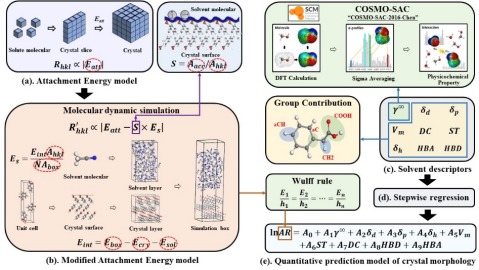 将晶体形貌定量预测模型与计算机辅助分子设计方法(CAMD)耦合,开展同步集成晶体形貌、收率、绿色安全的结晶溶剂设计方法研究(如图2所示)。