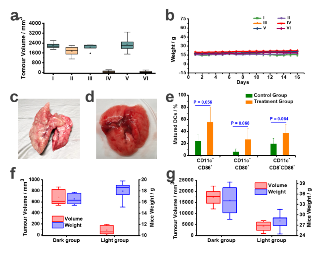 研究还发现,在水溶液中NBEX自聚集形成纳米粒子,该溶液经尾静脉注射到荷瘤小鼠体内后,能够快速富集到肿瘤区域。给药后,小鼠肿瘤区域经近红光照射治疗后,3天后实验组光照区肿瘤部位开始溃烂;5天后部分肿瘤脱落并形成痂。治疗一段时间后,相较于对照组,治疗组小鼠的肿瘤不但显示出了明显的抑制效果而且未见明显肿瘤转移。同时,对实验小鼠进行免疫分析的结果显示治疗组中小鼠的成熟树突细胞(DC)的含量明显高于对照组,这意味着治疗组的免疫激活率较高。这些实验结果表明,使用NBEX作为光敏剂的PDT不仅可以有效治疗实体瘤,抑制肿瘤转移,还可以在一定程度上诱导DC成熟,并且可能作为肿瘤疫苗来促进免疫应答。(图四)