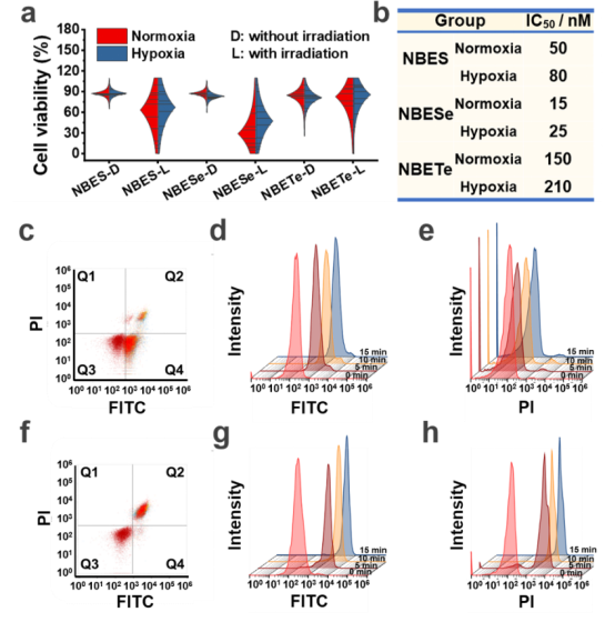 图三 常氧/低氧下NBEX的细胞毒性及流式细胞术检测细胞死亡方式