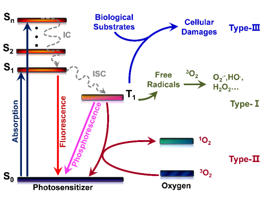 光动力疗法(PDT)是一种非侵入性治疗方式,在个性化医疗中获得了巨大的普及。与传统的化疗、放疗和手术相比,PDT具有微创、不受耐药性影响、治疗区域选择可控等优点。目前,PDT通过可见光照射激活光敏剂,在氧气存在下产生具有细胞毒性的活性氧物种(I型和II型机制,图一),杀伤过程依赖氧气。虽然I型光敏剂可以通过氧气的部分循环减轻PDT过程对氧的依赖,但光敏化过程仍需要氧气来维持。然而,实体肿瘤所处的微环境往往是缺氧环境,这极大影响了PDT过程中光敏药物对肿瘤细胞的杀伤作用。