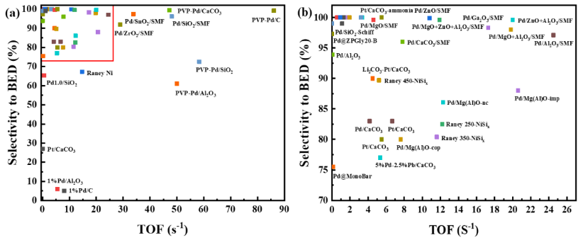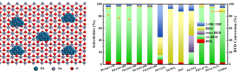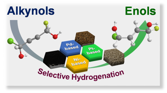 此外,梁长海教授团队还应邀在纪念中国科公司大连化学物理研究所辛勤研究员的《催化学报》专刊发表综述文章“Highly selective catalysts for the hydrogenation of alkynols: A review”(Chin. J. Catal., 2021, 42: 2105–2121),从经典的Lindlar催化剂和Raney Ni催化剂到生物基金属催化新材料,系统综述了近几十年炔醇选择加氢催化剂,对催化剂本身的金属活性中心、助剂(第二金属、有机配体、稳定剂)的作用、载体的性质(孔结构、酸碱性、金属与载体强相互作用)、反应条件等方面对催化活性、目标产物的选择性和稳定性的影响进行了归纳。借助先进的表征技术、理论计算和实验结果的指导,阐述了炔醇选择加氢反应的机理。研究发现:(a)在所有贵金属催化剂中,Pd基催化剂对炔醇半加氢制烯醇的效率最高,选择性最好。稳定剂、抑制剂的加入可以提高中间体的选择性,但在一定程度上降低了催化活性。此外,Zn、In、Cu等第二金属的掺杂可以调节金属Pd的几何效应和电子结构,从而调节底物和中间产物的吸附,抑制过度加氢。与传统的Lindlar型催化剂相比,这种Pd基合金或金属间化合物可广泛应用于炔醇的选择性加氢反应中,显著强化烯醇的选择性,但不会产生有毒添加剂的危害。(b) Ni基材料作为可替代贵金属催化剂,可分别实现炔醇的高选择性加氢制备烯醇或烷醇。然而,与贵金属催化剂相比,其反应条件相对苛刻。炔醇加氢产物分布很大程度上取决于助剂的引入和载体的酸性。此外,碳物种易沉积在Ni表面造成活性位点被覆盖,且在水热环境下Ni颗粒易团聚而失活,因此,用于炔醇选择加氢反应的镍基催化剂稳定性仍有待提高。