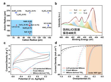 图2 (a) 无机盐阴阳离子半径与其饱和溶液水活度的关联规律;(b) 在饱和LiCl溶液中保存400天后的Ti3C2Tx MXene的XPS谱图;此MXene在保护前后的(c)赝电容性能与(d)近红外光辐照下的析氢活性比较。