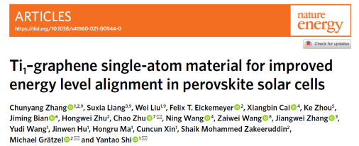 研究成果以“Ti1–graphene single-atom material for improved energy level alignment in perovskite solar cells”为题发表于能源领域顶级期刊《Nature Energy》(DOI : 10.1038/s41560-021-00944-0,影响因子60.9)。该研究工作由校内外多个课题组共同努力完成,太阳成集团tyc122ccvip官网入口为第一作者和第一通讯单位,太阳成集团tyc122ccvip官网入口博士生张春阳为共同一作(排名第一)。本项研究的参与单位包括:洛桑联邦理工公司、东南大学、香港科技大学、厦门大学、中科院大连化学物理研究所。本项研究获得了国家自然科学基金(51872036, 51773025, 11504046),“兴辽英才计划”项目(XLYC2007038, XLYC2008032)、大连市科技创新基金(2018J12GX033, 2019J12GX032)、辽宁省中央引导地方科技发展资金等资助(2021JH6/10500152)。