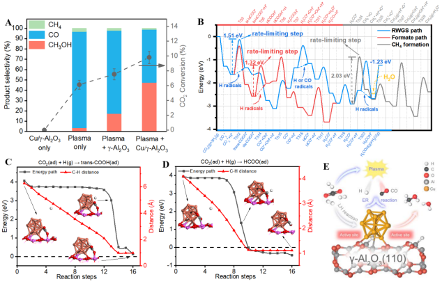 图3.(A)室温常压条件下CO2加氢反应结果;(B)Cu13/γ-Al2O3 催化剂表面CO2分别通过甲酸盐路径和逆水煤气变换路径进行加氢生成CH3OH的反应步骤及能垒;(C)等离子体产生的H自由基通过E-R机理消除逆水煤气变换路径速率控制步骤的能垒;(D)等离子体产生的H自由基通过E-R机理消除甲酸盐路径速率控制步骤的能垒;(E)Cu/γ-Al2O3 催化剂与等离子体协同促进室温常压条件下CO2加氢制甲醇反应机理。