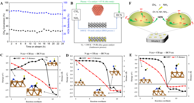 图2.(A)耦合反应结果;(B)本文提出的路线与工业路线的比较;(C)N与CH自由基通过L-H机理生成HCN的动力学过程;(D)吸附态CH物种与N自由基通过E-R机理生成HCN的动力学过程;(E)吸附态N物种与CH自由基通过E-R机理生成HCN的动力学过程;(F)Cu/S-1催化剂协同等离子体引发甲烷氨重整反应生成HCN和H2反应机理。