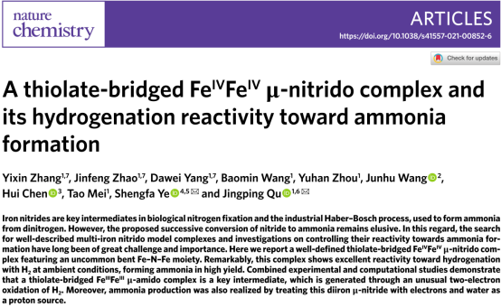 公司精细化工国家重点实验室曲景平教授研究团队与中国科公司大连化学物理研究所叶生发研究员等合作,在仿生化学模拟生物固氮酶研究领域又取得了新进展。相关研究成果以“硫桥联四价四价双铁氮桥配合物及其对氨生成的加氢反应性能”为题,近日发表在《自然•化学》(Nature Chemistry)上。同时,德国布伦瑞克工业大学Marc D. Walter教授,在《自然•化学》新闻与观点栏目中,以“重新审视氨的形成(Ammonia formation revisited)”为题,对该研究工作的意义和结果进行了积极评述。这是曲景平研究团队,继2013年在仿生化学固氮体系的构筑与功能化研究工作的基础上,取得的又一项重要进展,系统性研究成果连续发表在《自然•化学》期刊上(Nature Chemistry 2013,5, 320;《2014中国科学发展报告》)。