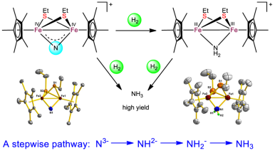 无论是在工业合成氨,还是在生物固氮酶固氮过程中,铁氮化物(Fe≡N)均被认为氮气还原转化为氨气的关键中间体。近年来,基于理论计算研究推测,活泼的氮化物中间体的生成与氢化还原放氨,可能是通过多个铁中心的协同作用而得以实现的,但是迄今为止仍然缺乏可靠的实验证据。因此,构筑双核铁氮化物模型配合物并实现逐步还原放氨,特别是直接利用氢气活化放氨功能具有十分重要的科学意义和挑战性。
