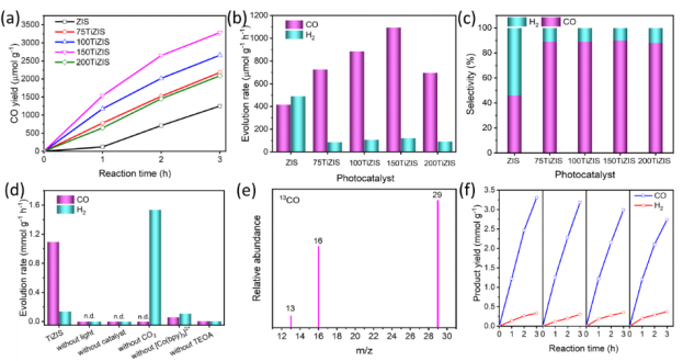 图2.(a)CO产量随着时间的变化,(b)不同比例TiZIS上CO和H2的产率,(c)CO的选择性变化,(d)反应条件的控制实验,(e)同位素标记的质谱分析,(f)稳定性测试。