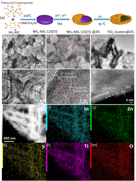 图1.(a)TiZIS材料的合成流程图,(b.c)扫描电镜照片,(d)透射电镜照片,(e.f)高分辨率的透射电镜照片,(g)球差电镜照片,(h-m)元素分布照片。