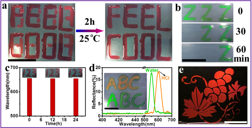 图4. 结构色图案的时空响应性和水写结构色保留时间的可控性