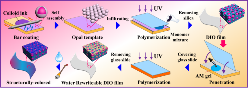 研究人员通过在双反蛋白石光子晶体(DIOPC)膜的反蛋白石聚合物骨架孔内填充丙烯酰胺的乙醇分散液,然后光聚合形成亲水的聚丙烯酰胺 (PAM) 凝胶网络,制备了具有超快响应时间(~0.8 s)和强健水可重写(>500次“写-擦-写”)性能的凝胶杂化的水可重写DIOPC膜 (图1)。反蛋白石聚合物骨架孔内形成的亲水PAM凝胶网络可以诱导水快速渗透进反蛋白石聚合物骨架的孔内,使得孔内的聚苯乙烯微球在水环境中从随机分布到受液体浮力作用而均匀分布,从而消除散射干扰,产生亮丽的结构色(图2)。