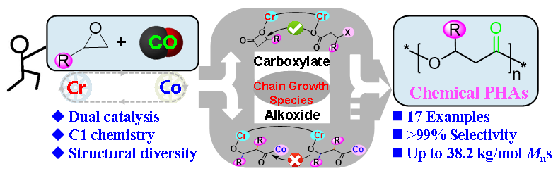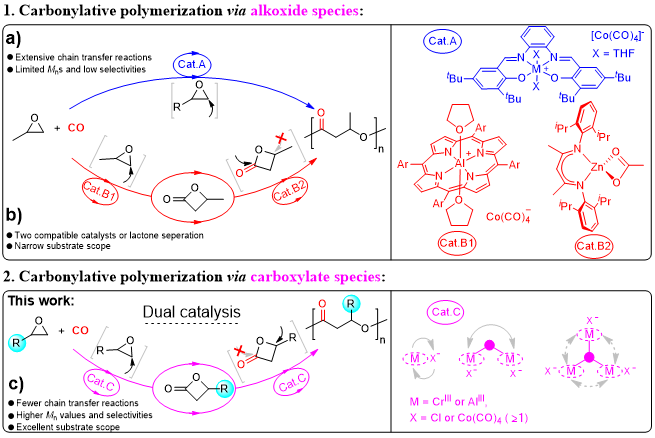 与传统生物发酵合成PHAs相比,由金属配合物催化环氧化物的羰化聚合是制备聚羟基脂肪酸酯的有效策略。环氧烷烃作为廉价易得的大宗化学品,其和C1资源直接羰化聚合反应因具有原子经济性,且反应的高选择性和对环境的友好性,可充分利用资源和保护环境,符合绿色化学发展的趋势,受到学术界及工业界青睐。但是,由于传统的环氧化物的直接羰基化聚合方法仍然存在单体转化率和聚酯选择性低的问题,其过程存在不可避免的强亲核性烷氧中间体的链增长模式(图1),多数得到低分子量< 2000 g/mol的寡聚物,这也是催化聚合领域的一个重大挑战。