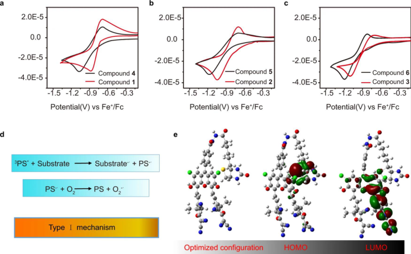 光动力治疗(PDT)作为一种新兴的恶性肿瘤的治疗方式,其基本原理为光敏剂将吸收的光能转化为活性氧(ROS)以诱导细胞凋亡和组织损伤。根据不同的光化学反应过程,PDT分为两种作用机制:I型和II型。II型PDT主要基于产生高毒性的单线态氧(1O2)杀死肿瘤细胞,在目前的光动力治疗中占主导地位。然而,II型PDT高度依赖于肿瘤部位的氧气浓度,这与肿瘤缺氧的固有性质相冲突,因而治疗效果不尽如人意。与II型机制中激发态光敏剂直接将能量转移给O2不同,I型过程是通过激发态光敏剂将电子或氢质子转移到周围的基质,从而产生自由基物种(例如,超氧阴离子(O2−•)和羟基(OH•)自由基)。其中,过量的O2−•能够与蛋白质,DNA和脂质反应,对细胞造成不可逆转的损害。重要的是,O2−•还可参与超氧化物歧化酶(SOD)介导的歧化反应,从而实现O2的再利用并引发其他剧毒活性氧物种的生成,可以有效缓解乏氧限制。然而,在I型光敏剂的设计上,很少有简便且通用的策略。