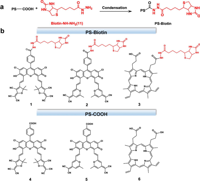 图1(a)光敏剂生物素化策略。(b)化合物1-6的化学结构。