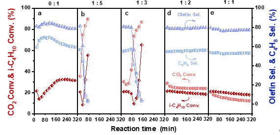 不同CO2/i-C4H10进料比下异丁烷脱氢反应性能