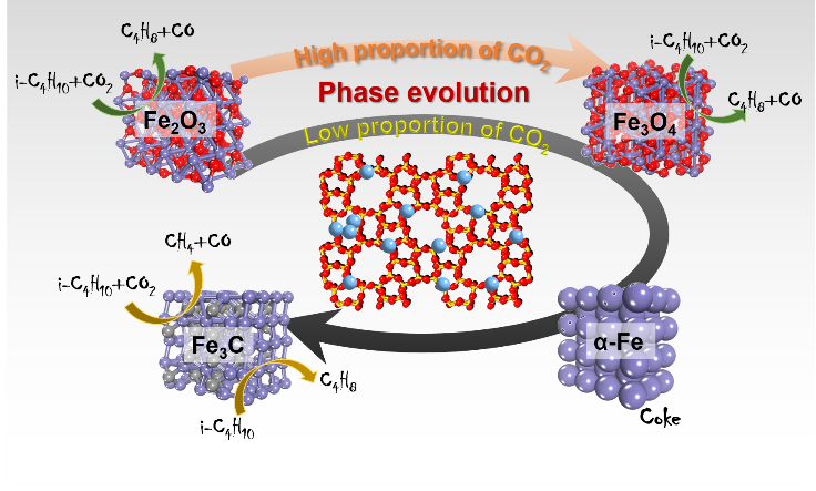 Fe基催化剂具有价格低廉、环境友好等优势,被应用于催化乙烷、丙烷、异丁烷等烷烃脱氢反应中。在此过程中,将二氧化碳作为弱氧化剂引入,可以促进烷烃转化、减少积炭、抑制深度氧化,是目前的研究热点之一。CO2引入对Fe基催化剂的活性相演变规律的研究将极大促进铁基催化剂性能的优化。