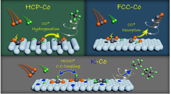 该工作还考察了碱金属K在CO2加氢中的作用机制。K通过促进CO2吸附、减小O*物种的移除能垒,显著提高了HCP-Co和FCC-Co催化剂上的CO2转化活性,并通过HCOO*路径生成少量C2+烃类产物。文章通过改变Co基催化剂晶相结构和电子分布,调变催化剂对反应物和中间物种的吸附和加氢活化能力,从而提高C2+烃类产物的选择性,为设计合成高活性Co基催化剂提供了新思路。